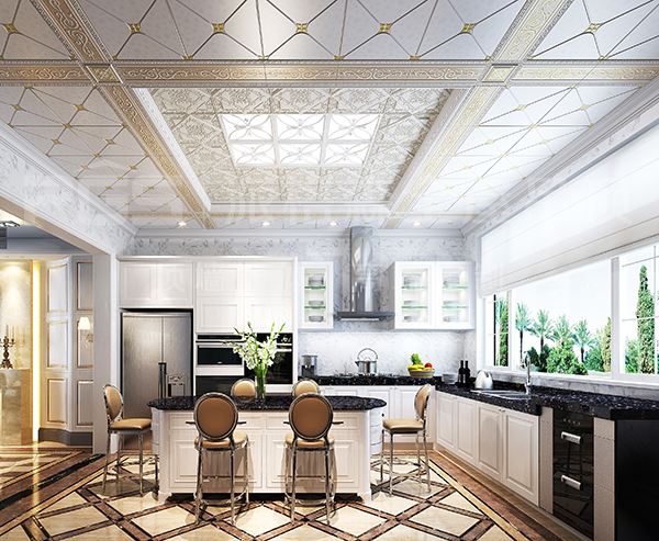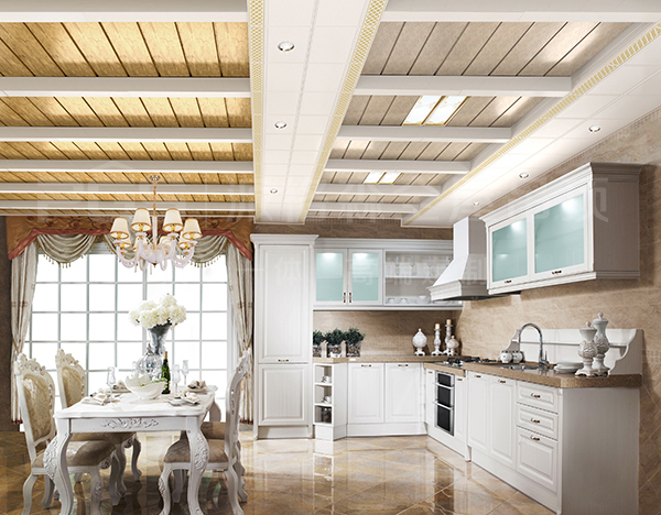 餐廚合并這種布置就餐時上菜快速簡便,能充分利用空間,較為實用。要盡量使廚房和餐室有自然的隔斷或使餐桌布置遠離廚具,餐桌上方應設集中照明燈具。通過頂面或地面進行區域劃分,案例中就是直接通過兩種顏色的條扣吊頂將廚房與餐廳劃分,使得空間顯得明亮開闊。